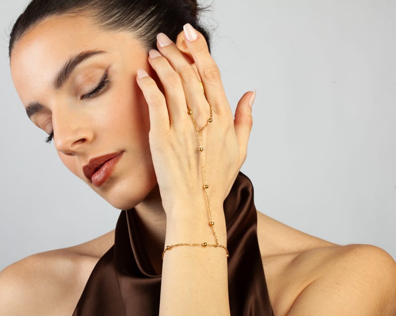 Η Grace Chain είναι ένα φίνο και εκλεπτυσμένο κόσμημα που ενώνει αρμονικά το βραχιόλι με το δαχτυλίδι μέσω μιας λεπτής χρυσής αλυσίδας, διακοσμημένης με μικρές σφαιρικές λεπτομέρειες. Ο minimal σχεδιασμός της προσφέρει διακριτική λάμψη και θηλυκή κομψότητα, καθιστώντας την ιδανική επιλογή για καθημερινή χρήση αλλά και για ιδιαίτερες εμφανίσεις. Φοριέται μόνη της ή σε layering, προσθέτοντας ένα elegant και σύγχρονο στοιχείο σε κάθε σύνολο.