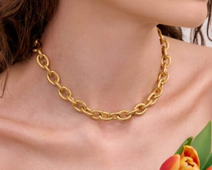 Η γυαλιστερή χρυσή επιφάνειά του αντανακλά το φως με κομψότητα, ενώ το chunky design του το μετατρέπει σε ένα κόσμημα που τραβά αμέσως τα βλέμματα. Ιδανικό για γυναίκες που αγαπούν τα μοντέρνα, δυναμικά κοσμήματα και θέλουν ένα κομμάτι που ξεχωρίζει τόσο σε καθημερινές εμφανίσεις όσο και σε πιο ιδιαίτερα looks.