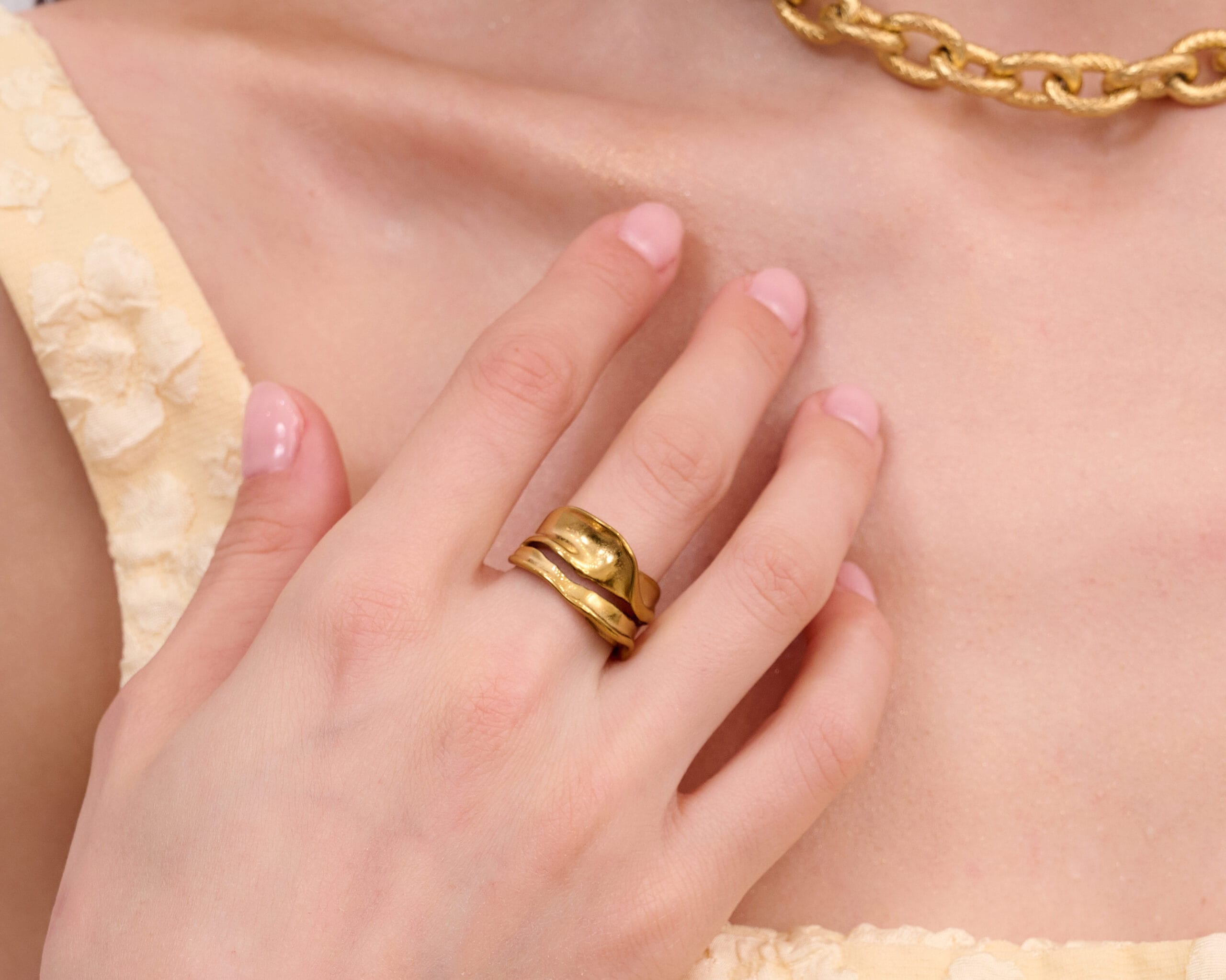 Ένα εντυπωσιακό και μοντέρνο δαχτυλίδι που αποπνέει δυναμική κομψότητα.  Ξεχωρίζει με τον ιδιαίτερο, κυματιστό σχεδιασμό του που δημιουργεί την αίσθηση δύο ρευστών χρυσών γραμμών οι οποίες αγκαλιάζουν αρμονικά το δάχτυλο. Η γυαλιστερή επιφάνειά του αντανακλά το φως με διακριτική λάμψη, χαρίζοντας ένα πολυτελές αποτέλεσμα που τραβά τα βλέμματα.
