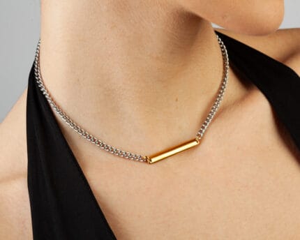 Ένα κομψό και μοντέρνο διχρωμό σκουλαρίκι που ξεχωρίζει για το ιδιαίτερο σχέδιο «το ένα μέσα στο άλλο». Ο συνδυασμός δύο χρωμάτων δημιουργεί βάθος και αντίθεση, προσδίδοντας δυναμισμό και στυλ στο κόσμημα.Ελαφρύ και άνετο, μπορεί να φορεθεί μόνο του για μια minimal αλλά εντυπωσιακή εμφάνιση ή να συνδυαστεί με άλλα κοσμήματα για layering και πιο ολοκληρωμένο look.
